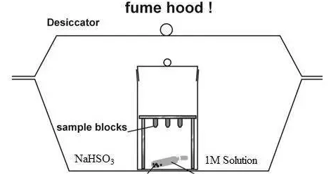 如果沒有餓酸晶體,只有2%的餓酸溶液,染色方法如下:把樣品塊用雙面膠粘在一個10 ml 的玻璃小瓶上部,加入2% 的餓酸溶液,蓋上蓋子,放在干燥器里,取出干燥器里面的硅膠,加入一定量的1M NaHSO3溶液,整個干燥器放在通風櫥里染色過夜。(注意:使用溶液會非常臟,所有東西都會被沾上有毒的餓酸)