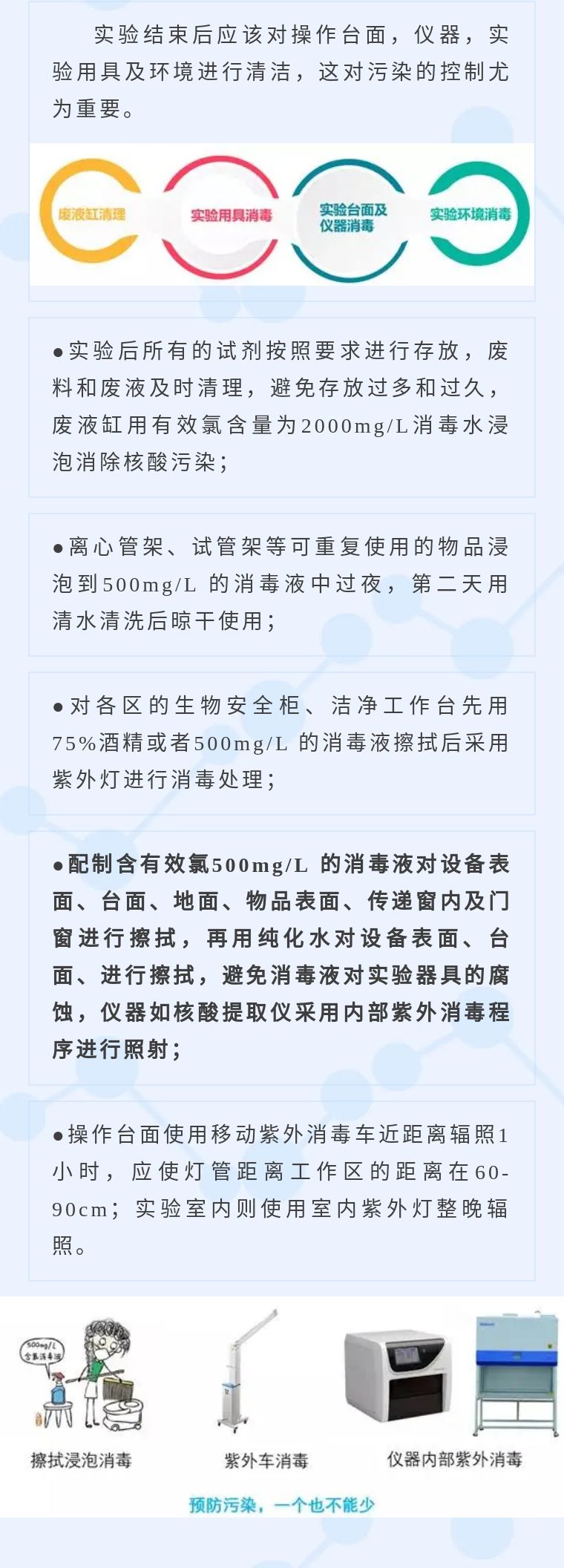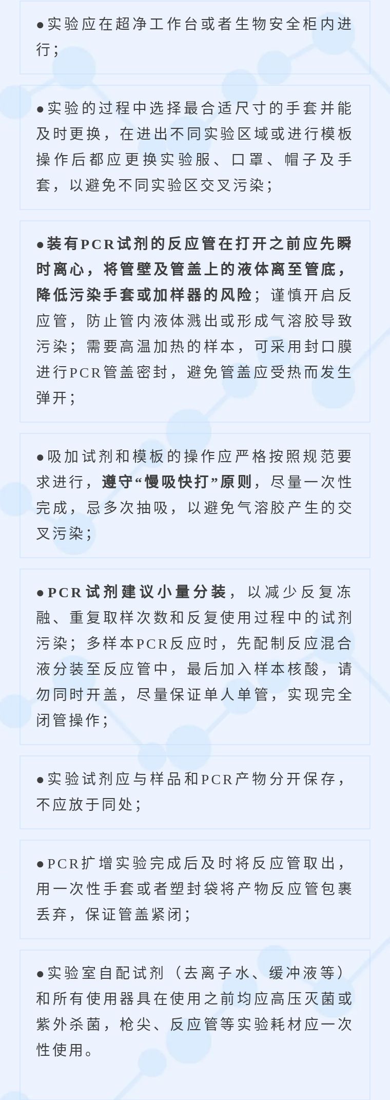 PCR 實驗強大的擴增能力和檢測的敏感性致使極其微量的污染都會導致假陽性的出現,所以 PCR 實驗過程中防污染工作是一個不容忽視的問題,不能因為工作的熟練反而松懈下來,每日實驗前和實驗結束后一定按要求對實驗室進行徹底的清潔消毒,才能把污染的可能性扼殺在搖籃中,避免造成嚴重的損失
