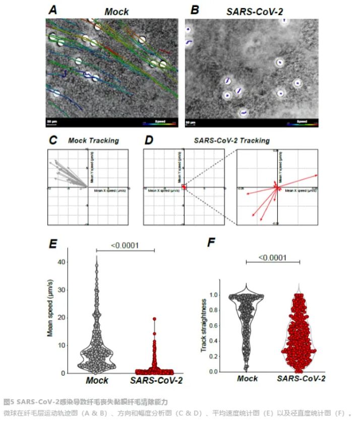 接下來,作者用時間序列拍攝檢測SARS-CoV-2感染對上皮體外重建模型微粒清除能力的影響(圖5A、B)。結(jié)果顯示,SARS-CoV-2感染不僅影響纖毛擺動的方向(圖5C、D)和速度(圖5E),還影響纖毛擺動的協(xié)調(diào)性(圖5F,徑直度)。換句話說,SARS-CoV-2感染導(dǎo)致的纖毛損傷能顯著降低呼吸道上皮的黏膜纖毛清除能力。