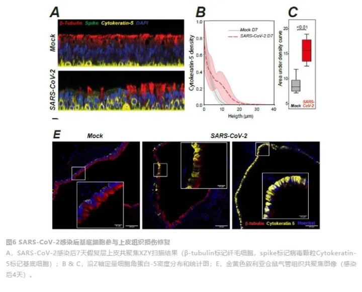 最后,作者在體外(上皮重建模型)和體內(nèi)(金黃色敘利亞倉鼠模型)研究中對SARS-CoV-2感染后的呼吸道應(yīng)激修復(fù)能力進(jìn)行檢測。結(jié)果顯示,感染7天后上皮重建模型中基底細(xì)胞的密度增加,部分向纖毛細(xì)胞轉(zhuǎn)變(圖6A-C),培養(yǎng)體系內(nèi)IFN表達(dá)水平上升(結(jié)果見論文原稿)。說明SARS-CoV-2感染可觸發(fā)上皮防御和修復(fù)機制。在金黃色敘利亞倉鼠模型中,基底細(xì)胞的形態(tài)轉(zhuǎn)變則跟SARS-CoV-2感染時病毒的計量正相關(guān)(圖6E)。至此,作者根據(jù)研究得到的結(jié)論和已有研究成果推定:SARS-CoV-2感染后固有的上皮防御和修復(fù)機制可能發(fā)生得太晚,來不及阻止病毒在呼吸樹(Respiratory tree)中的傳播和繼發(fā)性感染的發(fā)生。