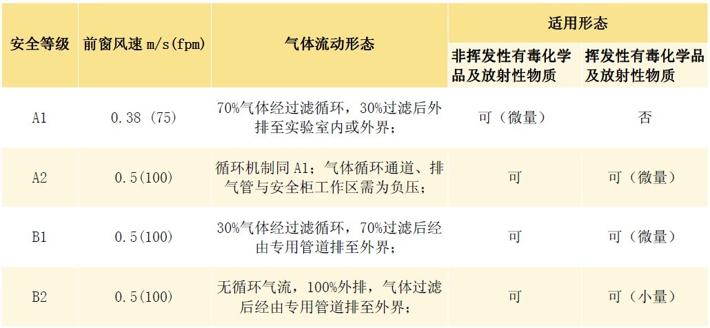 生物安全柜可分為一級、二級和三級三大類以滿足不同的生物研究和防疫要求。一級生物安全柜可保護工作人員和環境而不保護樣品。氣流原理和實驗室通風櫥一樣,不同之處在于排氣口安裝有HEPA 過濾器。所有類型的生物安全柜都在排氣和進氣口使用HEPA 過濾器。一級生物安全柜本身無風機,依賴外接通風管中的風機帶動氣流,由于不能保護柜內產品,目前已較少使用。二級生物安全柜是目前應用最為廣泛的柜型。按照NSF49 的中的規定,二級生物安全柜依照入口氣流風速、排氣方式和循環方式可分為4 個級別:A1 型,A2 型(原B3 型),B1 型和B2 型。所有的二級生物安全柜都可提供工作人員、環境和產品的保護。A1 型安全柜前窗氣流速度最小量或測量平均值應至少為0.38m/s。70%氣體通過HEPA 過濾器再循環至工作區,30%的氣體通過排氣口過濾排除。A2 型安全柜前窗氣流速度最小量或測量平均值應至少為0.5m/s。70%氣體通過HEPA 過濾器再循環至工作區,30%的氣體通過排氣口過濾排除。二級B 型生物安全柜均為連接排氣系統的安全柜。連接安全柜排氣導管的風機連接緊急供應電源,目的在斷電下仍可保持安全柜負壓,以免危險氣體泄漏如實驗室。其前窗氣流速度最小量或測量平均值應至少為0.5m/s(100fpm)。B1 型70%氣體通過排氣口HEPA 過濾器排除,30%的氣體通過供氣口HEPA 過濾器再循環至工作區。B2 型為100%全排型安全柜,無內部循環氣流,可同時提供生物性和化學性的安全控制。三級生物安全柜是為4 級實驗室生物安全等級而設計的,柜體完全氣密,工作人員通過連接在柜體的手套進行操作,俗稱手套箱(Golve box),試驗品通過雙門的傳遞箱進出安全柜以確保不受污染,適用于高風險的生物試驗。